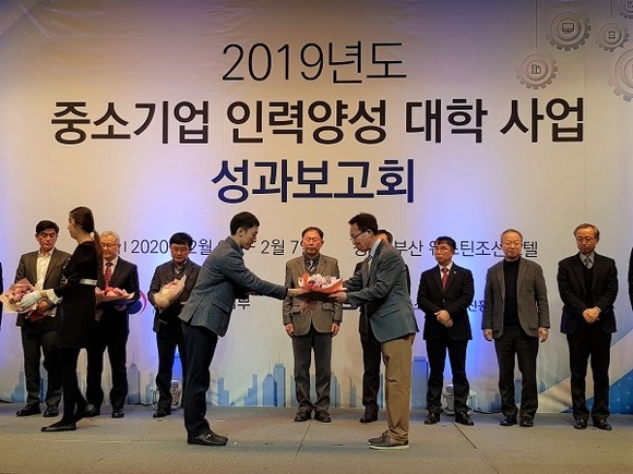 경상대학교는 공과대학 산업시스템공학부 전차수 교수(사진 오른쪽)가 6일 부산 웨스틴조선호텔에서 열린 '2019년 중소기업 인력양성사업 성과보고회'에서 중소벤처기업부 장관 표창장을 받았다고 밝혔다.