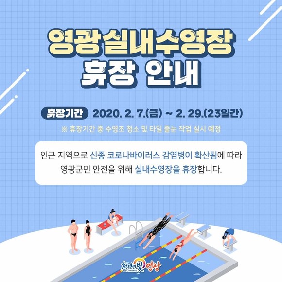 전남 영광군은 신종 코로나바이러스 감염증을 예방하고 군민 안전을 확보하기 위해 영광실내수영장을 휴장한다. 휴장기간은 7일부터 2월 29일까지 23일간이다.