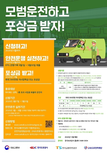 선발된 모범 화물운전자에게는 DTG(디지털운행기록계) 운행기록 순위에 따라 최대 300만원에서 20만원까지 자녀 장학금을 지급하며, 재학자녀가 없는 경우 같은 금액의 포상금을 지급한다.