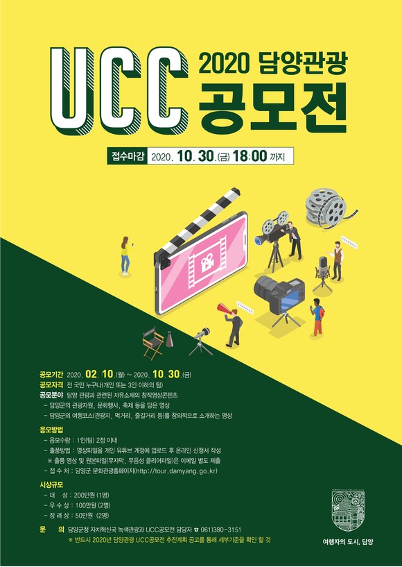 담양군은 담양의 아름다움을 널리 알릴 수 있는 영상콘텐츠를 발굴하기 위해 아름다운 자연경관 및 관광명소, 축제 등을 주제로 제작한 영상을 대상으로 ‘2020 담양관광 UCC공모전‘을 개최한다.