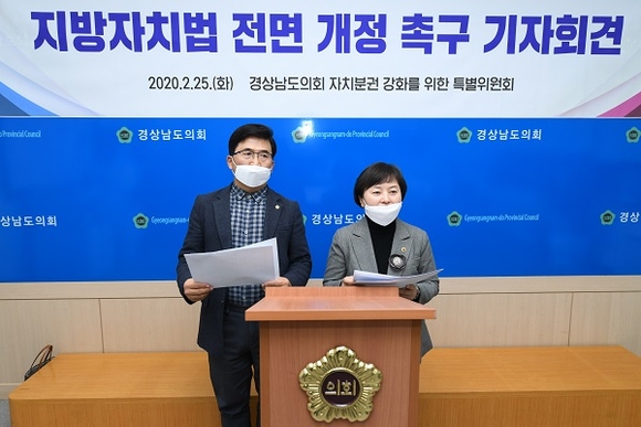 경남도의회 자치분권 강화를 위한 특별위원회는 25일 도의회 브리핑룸에서 기자회견을 갖고 지방자치법 전부개정을 촉구했다.