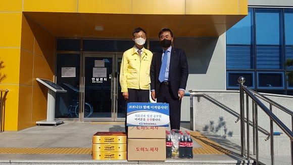 한철수 창원상공회의소 회장(오른쪽)이 2일 관내 창원보건소와 마산보건소를 방문, 방역과 진료활동 중인 관계자들의 노고에 감사의 뜻과 격려품을 전달했다. (사진=창원상의 제공)