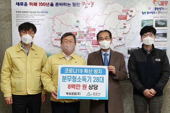 밀양시는 3일 북성공업(주), 자유총연맹 밀양시지회 청년회, 밀양을 사랑하는 모임에서 방역 분무기 등을 밀양시에 기부했다고 밝혔다.
