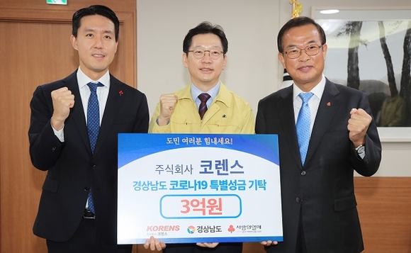 이 자리에서 조형근 코렌스 대표이사는 "코로나19 확산방지에 힘쓰고 있는 의료진과 생활에 어려움 겪고 있는 취약계층에게 써 달라"며 특별성금 3억 원을 경남사회복지공동모금회에 지정기탁 했다.