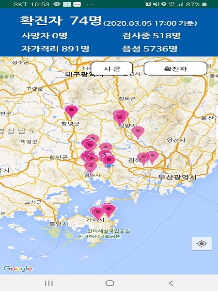 경남도청(도정혁신추진단)에 근무하는 사회복무요원들이 구글 지도 기반으로 경남 지역에 한정해 서비스를 제공하는 '코로나19 경남 앱(application)'을 개발해 도민들이 무료로 이용할 수 있도록 배포해 화제다.