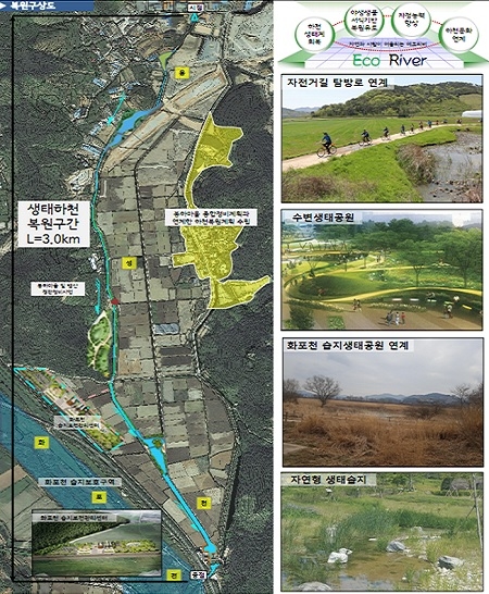 총연장 3㎞에 봉하화포길 등 생태탐방로와 연계한 물길, 탐방로를 복원하고 화포천 생태습지공원과 연계한 생태습지, 수변생태공원 등을 조성한다. 시는 이달 실시설계 발주에 이어 내년 상반기 착공, 2023년 12월 완공할 계획이다.