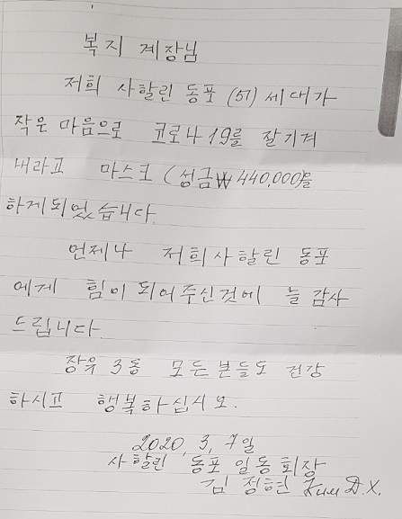 장유3동행정복지센터는 관내 거주하는 사할린 동포들이 코로나19 예방용 마스크 구입에 써달라며 11일 성금 44만원을 기탁했다고 밝혔다.