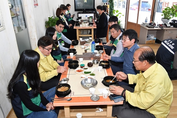 김일권 양산시장은 11일 시 재난안전대책본부 안전총괄과 직원들과 동면 소재 '본동국밥칼국수'를 방문해 오찬을 함께하며 그동안의 노고를 격려했다.