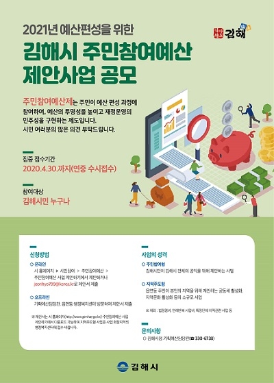 경남 김해시는 2021년도 예산 편성에 반영할 '주민참여예산 제안사업'을 4월 말까지 공모한다고 17일 밝혔다.