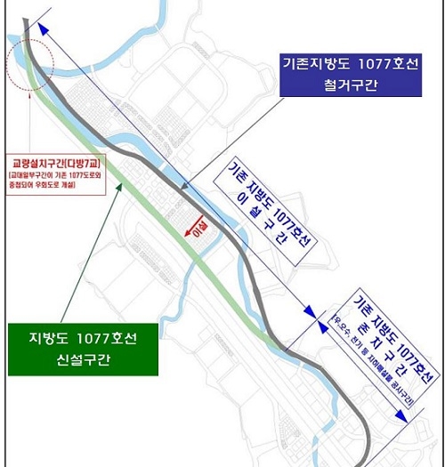 전체 이설도로는 폭 16~20m, 길이 4km의 왕복 6차선 도로로 내년 상반기 이후에 개통 예정이며, 이번 임시개통 구간 도로는 기존 지방도 1077호선 이설구간과 임시우회도로구간을 합쳐 폭 15m~17m , 길이 3.5km 구간으로 도로규모는 왕복 4차로이며 내송삼거리에서 사송고가차도 인근 구간에 해당된다.