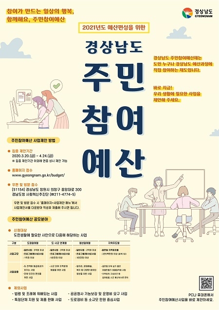 경남도는 주민참여예산제 홈페이지를 구축하여 도민의 온라인 참여를 강화하는 내용을 담은 '2021년 경남형 주민참여예산제'를 운영한다고 23일 밝혔다.