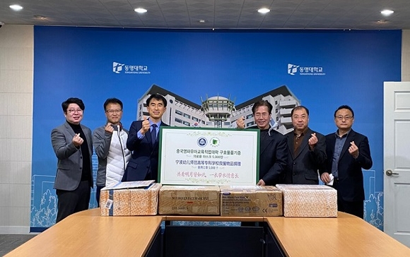 동명대는 26일 총장실에서 ▲닝보유아사범전문대학(Ningbo Childhood Education Collage)으로부터의 마스크 5천매 ▲길림예술대(吉林艺术学院) 왕람(王岚) 교수로부터의 마스크 1만매 기증식을 가졌다.