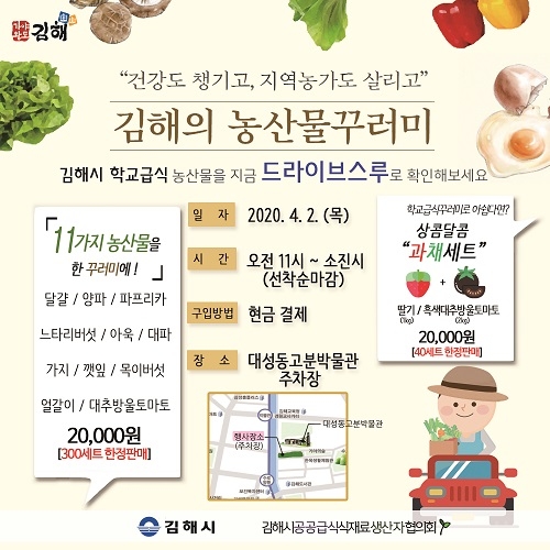 경남 김해시는 2일 대성동고분박물관 주차장에서 '김해시 학교급식 농산물 드라이브스루 판매행사'를 개최한다고 밝혔다.
