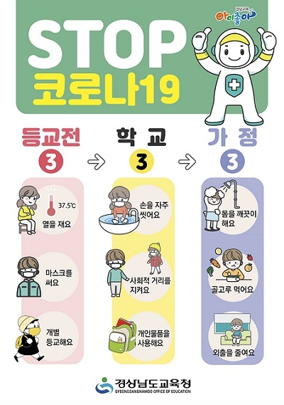 경남도교육청은 코로나19 예방에 능동적으로 대응하고자 'STOP 코로나19 지켜요 3·3·3' 자료를 제작, 전 초등학교에 배부한다고 8일 밝혔다.
