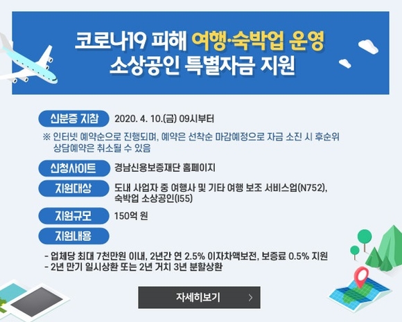 기타 자세한 내용은 경남도 홈페이지 공지사항 및 고시·공고란의 '코로나19 피해 여행·숙박업 운영 소상공인 특별자금 지원계획 공고문'을 참고하거나, 도 소상공인정책과 또는 경남신보로 문의하면 된다.