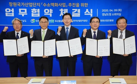 경남도가 9일 도청 소회의실에서 '수소액화 실증 플랜트 구축사업'을 위한 산업단지 환경개선펀드 투자사업의 성공적 추진과 상호간의 협력을 증진하기 위한 업무협약을 체결했다.