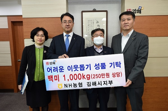 NH농협은행 김해시지부는 14일 저소득층에 전달해 달라며 백미 1000㎏(250만원 상당)을 김해시에 기탁했다.
