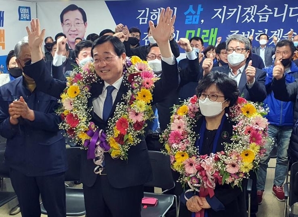 한편 김해을에서는 '컷오프' 이후 재공천을 받은 김정호 후보가 49.6%의 득표율을 기록하며 통합당 장기표 후보(41.6%)를 누르고 재선에 성공했다.