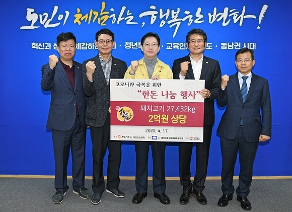 (사)대한한돈협회 경남도협의회가 16일 도지사 집무실에서 기증식을 갖고, 코로나19 위기극복을 위해 2억 원 상당의 돼지고기 2만 7432kg을 경남도에 전달했다.