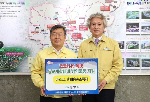 경남 밀양시는 20일 시청 시장실에서 밀양교육지원청과 등교 개학 대비 방역물품 전달식을 가졌다.