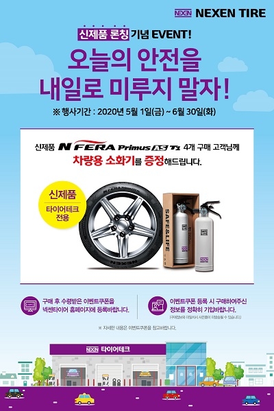 이벤트는 5월 1일부터 6월 30일까지 진행되며, '엔페라 프리머스 AS T1' 4개를 구매한 고객을 대상으로 '차량용 소화기'를 증정한다.