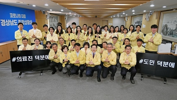 28일 경남도청에서 김경수 지사와 도청 코로나19 대응 종합상황실 근무자들이 의료진과 도민들에게 고마움을 전하는 '덕분에 챌린지'에 참여하고 있다. '덕분에 챌린지'는 SNS에 '존경'과 '자부심'을 뜻하는 수어 동작 사진을 올리고 '#덕분에캠페인', '#덕분에챌린지', '#의료진덕분에' 등 3개의 해시태그를 붙이는 국민 참여 캠페인이다.