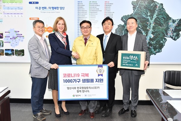 한국필립모리스(주) Irina Ashukina 양산공장장, 김주한 대외협력 상무, 대외협력 차장 김진혁, 김정모 부장은 지난달 29일 시장 집무실을 방문해 코로나19 극복 식품 키트 전달식을 가졌다.
