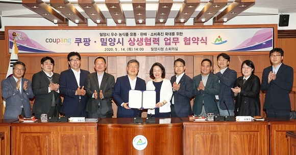 경남 밀양시는 14일 오후 시청 2층 소회의실에서 국내 온라인 쇼핑몰 쿠팡(주)과 밀양 우수농산물 및 가공식품의 직거래 유통판로 확대를 위한 업무협약을 체결했다.