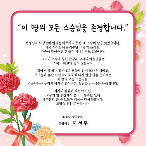허 시장은 스승의 날 메시지를 통해 “'스승의 은혜' 노래도, 카네이션도 없는 스승의 날이지만 위기와 혼란 속에서도 묵묵히 자리를 지켜주어 고맙고, 존경한다”는 말을 전했다.