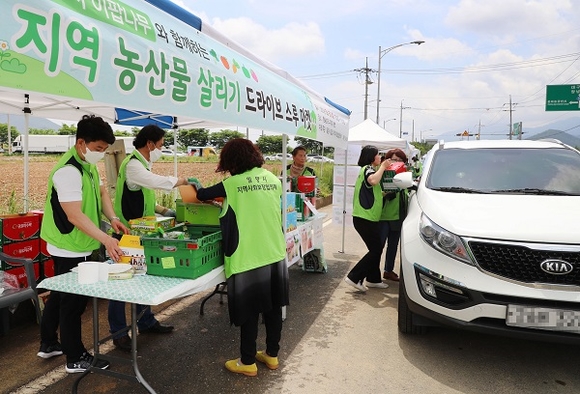 밀양시지역사회보장협의체가 코로나19에 따른 사회적 거리두기, 개학 연기 등으로 판로에 어려움을 겪고 있는 지역농가를 돕기 위해 지난 16일 위양지 방면 도로변에서 지역농산물 살리기 드라이브스루 마켓을 운영했다.