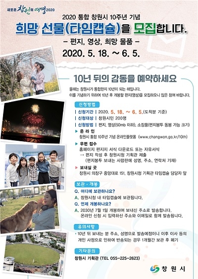 경남 창원시는 통합 10주년을 기념하기 위한 특별한 이벤트로 '10년 뒤에 감동! 희망선물 타임캡슐' 행사를 개최한다고 18일 밝혔다.