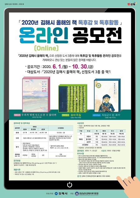 경남 김해시는 6월 1일부터 10월 30일까지 2020년 김해시 올해의 책 독후감 및 독후활동 온라인 공모전을 개최한다고 21일 밝혔다.