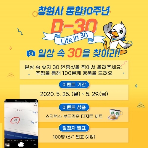 1차 이벤트는 25일부터 29일까지 창원시 공식 블로그와 페이스북을 통해 진행되며, 통합 10주년 D-30일을 기념해 일상 속에서 숫자 30을 찾아 인증사진을 올리면 된다. 시는 1차 이벤트 참여자 중 200명을 선정해 6월 1일 발표할 예정이다. 총 200만 원 상당의 경품이 지급된다.