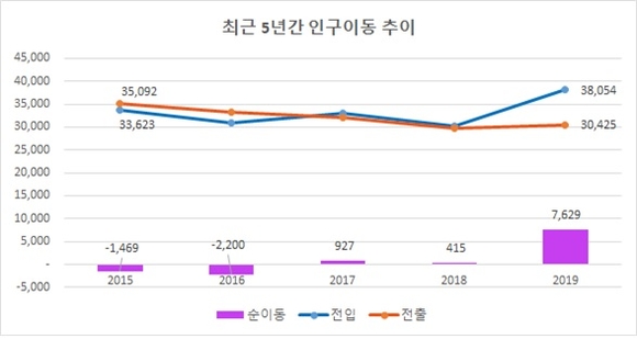 최근 5년간 김해시 인구이동 추이를 보면 `15년과 `16년에는 순유출이 조금 더 높았으나 `17년부터 순유입이 높아져 지난해에는 7629명을 기록했다.