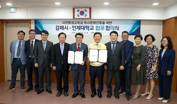 경남 김해시는 27일 오전 시청 회의실에서 인제대학교와 시민 평생교육과 독서문화 진흥을 위한 업무협약을 체결했다고 밝혔다.