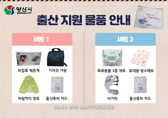 경남 양산시는 시에 주소를 둔 출산가구 2500명 대상으로 전국기초단체 최초 출산선물 온라인(정부24시)접수를 하면 언제든 원하는 곳으로 비대면 배송서비스를 제공해 큰 인기를 끌고 있다.