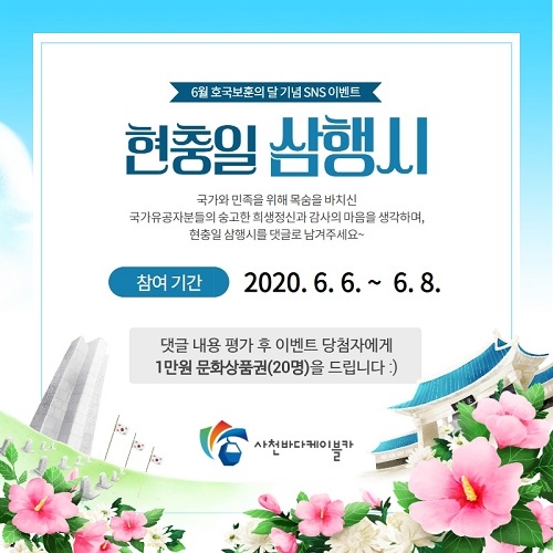 먼저 오는 6일부터 8일까지 '<호국보훈의 달 기념> 현충일 삼행시' 이벤트를 실시한다. 참여방법은 페이스북 또는 인스타그램 공식 계정을 팔로워한 뒤 이벤트 게시물에 국가를 위해 희생하신 분들께 감사의 마음을 담아 '현충일' 삼행시를 지어 댓글로 남기면 된다. 댓글 내용과 기타 준수사항을 평가한 후 1만 원 상당의 문화상품권을 20명에게 제공한다.
