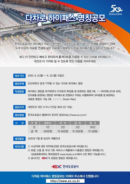 한국도로공사는 전국적으로 확대 설치 중인 '다차로 하이패스'의 새로운 브랜드 명칭을 대국민 공모한다고 8일 밝혔다.