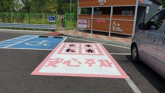 안심주차면은 노인, 임산부와 같은 교통약자 및 영유아 동반승객이 우선 주차할 수 있는 별도 주차면과 경사로를 화장실 앞에 설치해 화장실 이용을 보다 편리하게 이용할 수 있다.