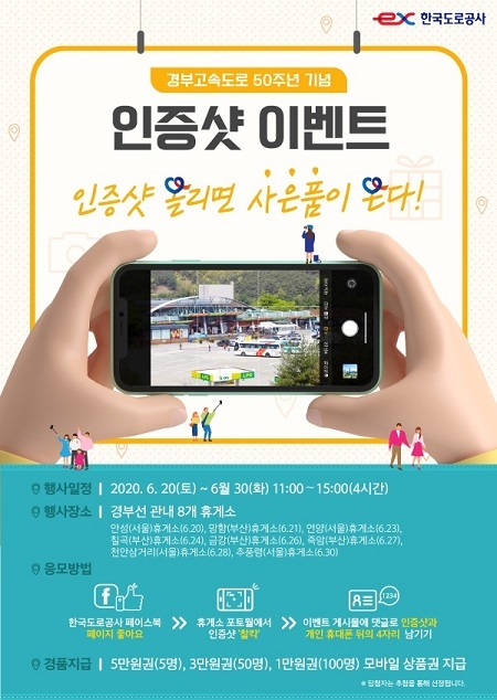 공사 관계자는 “경부고속도로 개통 50주년을 기념한 이번 이벤트를 통해 고속도로를 이용하는 고객들에게 감사의 마음을 전하려 한다”며 “다만 코로나19 예방을 위해 마스크 착용, 이격거리 준수 등 생활 속 거리두기 지침을 꼭 실천해 줄 것”을 당부했다.