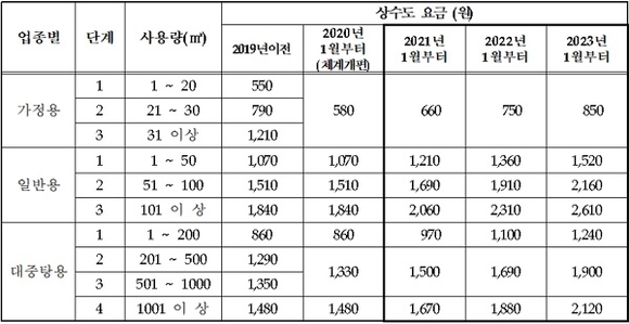 그 동안 지속적인 생산원가 상승과 안정적인 수돗물 공급을 위한 시설투자로 인해 상수도요금 현실화율이 해마다 하락, 지난해에는 78.6%까지 떨어져 현실화가 시급해지면서 올 1월부터 가정용 요금 누진제 폐지 및 대중탕용 요금의 누진단계 축소 개편 후 7월부터 3년간 13%씩 인상하기로 했었다.