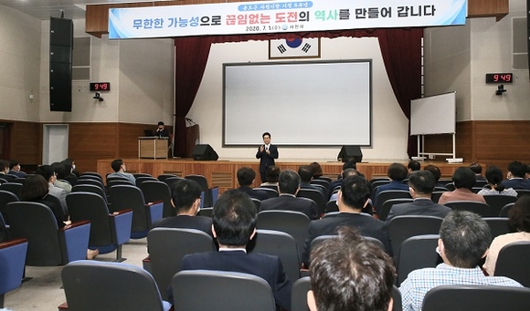 코로나19 예방 수칙을 철저하게 이행한 가운데 참석인원을 대폭 축소해 진행된 이날 기념행사는 7월 정례조회를 마친 후, 400석 규모의 대강당에 150여 명의 공무원이 참석한 가운데 지난 6년간의 주요 시정성과와 미래 발전 전략에 대해 기획예산담당관으로부터 보고가 있은 후 '직원들에게 들려주고 싶은 이야기'라는 주제로 송 시장이 직접 특강을 진행했다.