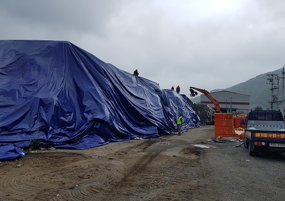 경남 사천시가 장마철에 대비해 사천강변에 방치돼 있는 폐기물에 우선 덮개를 설치해 수질오염 예방에 나섰다.
