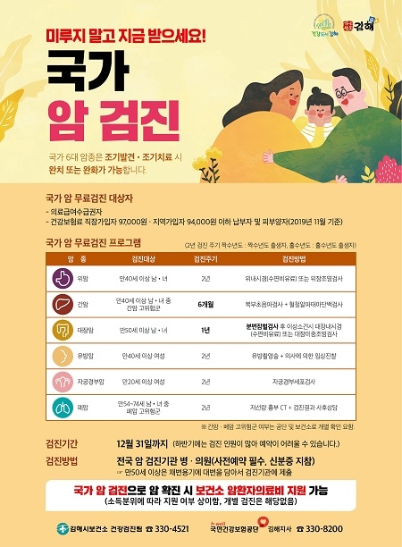 보다 자세한 내용은 김해시보건소 건강검진팀, 인구보건복지협회 경남지회로 문의하면 된다.
