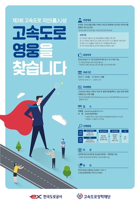 한국도로공사와 고속도로장학재단은 '고속도로 의인상(義人賞)' 후보자 추천을 8월 19일까지 받는다고 20일 밝혔다.
