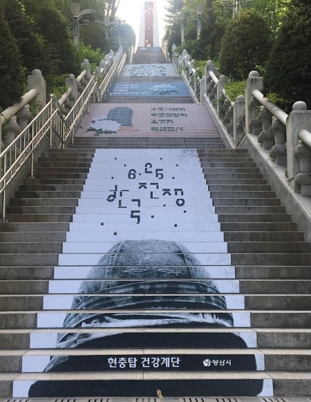 경남 양산시가 전국 최초로 국가를 위해 희생한 순국선열과 호국영령의 넋을 기리기 위해 마련된 현충탑(춘추공원 내)에 시민 건강증진을 위해 건강계단을 조성했다.