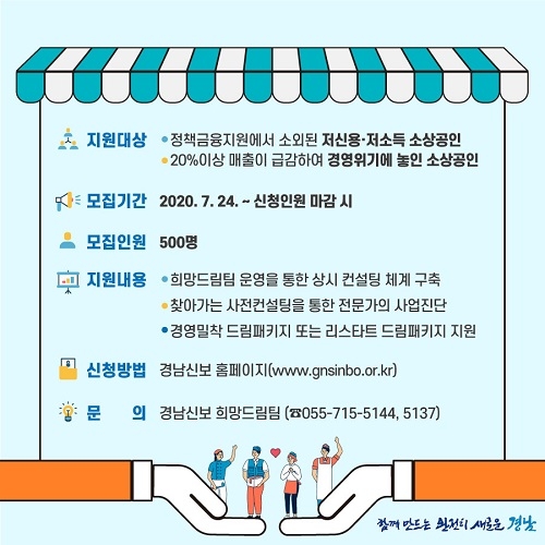 사업은 코로나19 위기 속에서 상대적으로 정책금융지원에서 소외를 받은 '저신용·저소득 소상공인'과 '매출이 급감해(20%이상) 경영위기에 놓인 소상공인'을 대상으로 진행하며, 7월 24일부터 500명을 상한으로 모집한다.