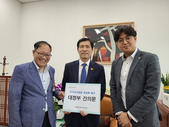 경남도의회 경제환경위원회 소속 송오성 더불어민주당 원내대표와 신상훈 의원은 27일 국회를 방문해 'STX조선해양 정상화 촉구 대정부 건의안'을 전달했다.