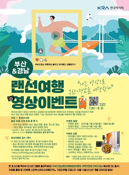 '랜선 여행'을 테마로 한 이번 이벤트는 부산·경남지역 또는 부경경마공원과 관련된 영상으로 접수가 가능하며, 영상형식 또한 브이로그, 뮤직비디오, 노편집 영상 등 자유 형식으로 남녀노소 누구나 쉽게 참여할 수 있다.