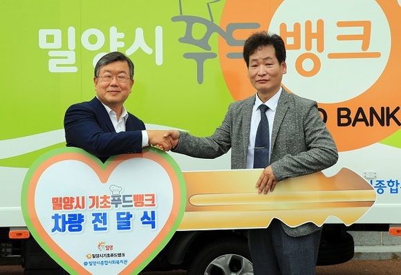 경남 밀양시는 30일 시청 광장에서 밀양시기초푸드뱅크 전용차량(냉동탑차) 전달식을 가졌다.
